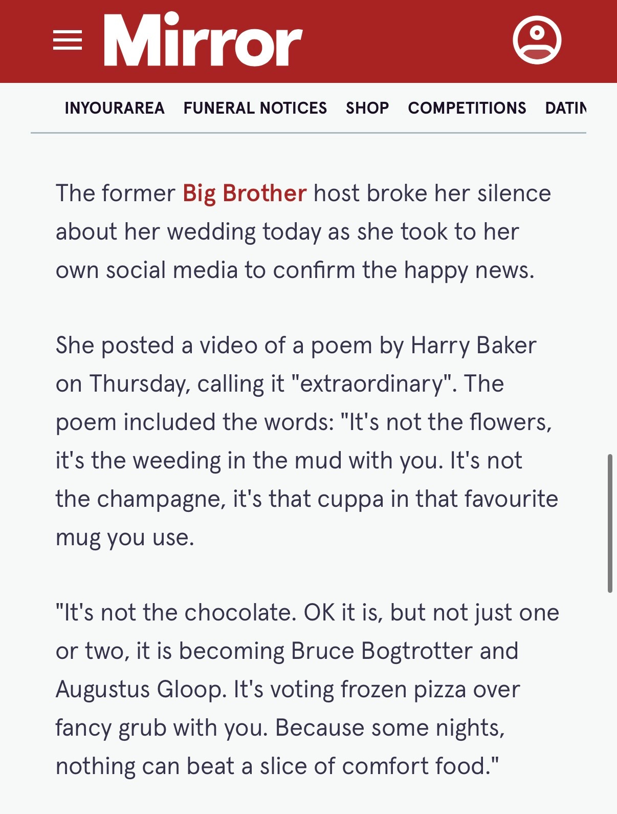 One final couldn’t-possibly-have-been-predicted twist for 2025 was that after sharing my trying poem on her page and asking me to contribute to her book, Davina McCall was due to come to one of the Christmas shows so we could finally meet in person. Sadly something came up so she couldn’t make it but she did share my Dust poem the next morning, which I didn’t realise at the time was also her announcing that she had got married in secret the week before (and possibly had it read at her wedding?), and led to it being quoted (and misquoted) in the Mirror, The Sun, and the Daily Mail, among others. Just in case you are also not a regular reader of these, you can of course still get it as a beautiful print for your home !