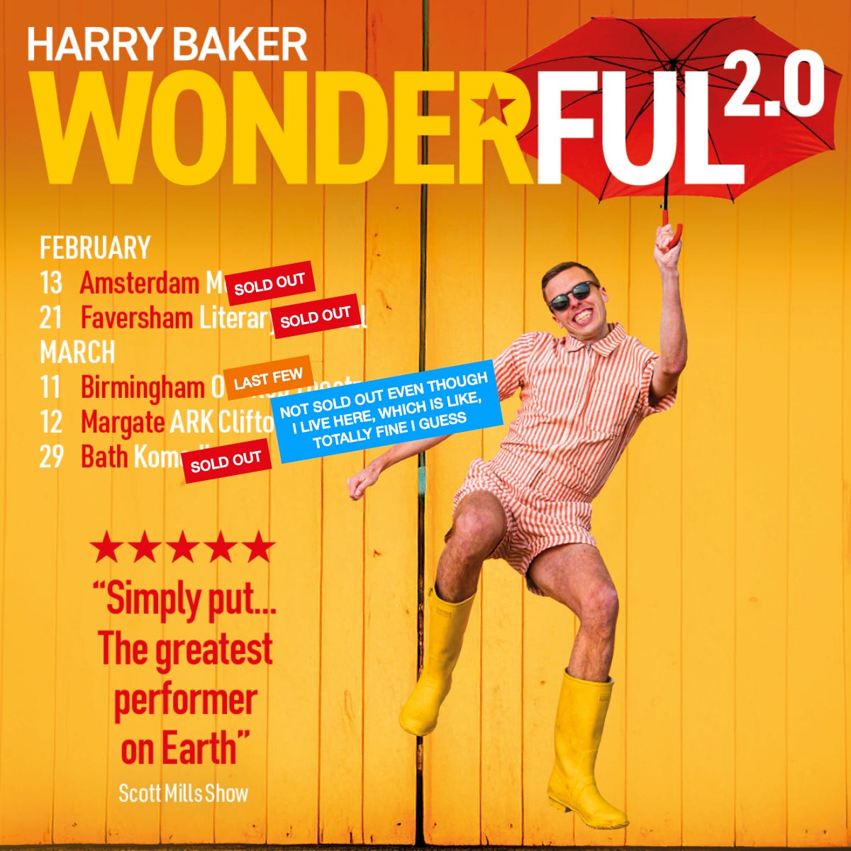 I probably shouldn’t admit this but in my head tour starts properly in April. So far I have had a lovely holiday in Amsterdam and a day-trip on the train to Faversham before having a couple of weeks at home to recover. That being said Birmingham is going to be absolutely mega and the only date they could fit in was in March, and Margate gigs are always the best because they are in Margate (and I am bringing over the brilliant Emmet O’Brien from Dublin for it especially) so they are less warm-up gigs and more Supa Hot Fire straight out of the gate, and I would love to see you there. You can see the whole tour poster below - April’s dates are almost sold out already so be sure to get in there quick, and we have also just added an extra date in Woking (which is the only free gig of the tour) on July 3rd. Other shows of note are Norwich and London which currently have extra dates pencilled but only if we sell the first ones out quickly enough, so it really does make a different if you get in there early.