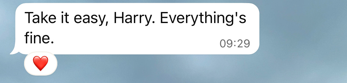 “Take it easy, Harry. Everything’s fine.” 6 words I had no idea I needed to hear so badly.